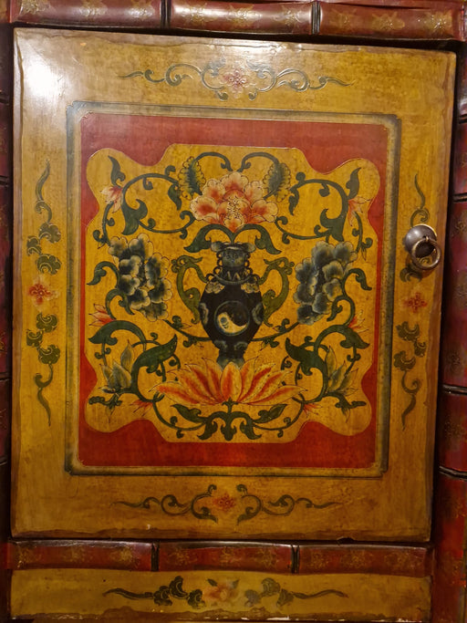 B: 108 H: 100 T: 37Schöne mongolische Kommode mit typischen floralen Malereien, sowie die Darstellung von Alltagsgegenständen. Die Patina wurde bei der Restaurierung ...