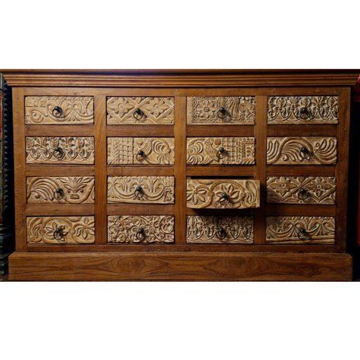 B: 136 H: 110 T: 46Massive und sehr schwere Teakholzkommode mit Tibetanischen Motiven. Ein außergewöhnliches Möbel für den besonderen Liebhaber.
