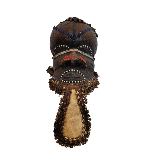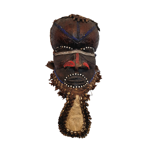 B: 50 H: 60 T: 40Originale Mukyeen Maske der Kuba aus Afrika. Reich verziert mit vielen Kaurimuscheln und kleinen Perlen bestickt.