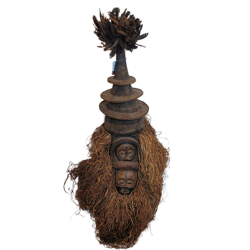 H: 76Tanzmaske der Grebo, original aus Liberia / Afrika. Aus Holz geschnitzt, Kopfschmuck mit Federn und Echthaarbart. Wohl zur Huldigung der Ahnen geda...