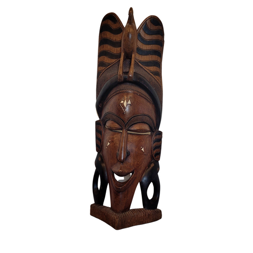 B: 30 H: 83 T: 18Wunderschöne stehende Holzmaske aus Afrika. Geschnitzt und handbemalt. Oben ist ein großer Vogel der das Haupt umrahmt.