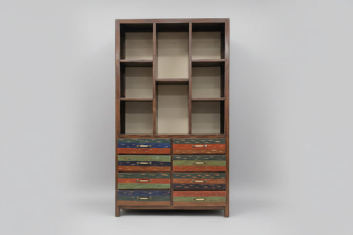 B: 68 H: 188 T: 40Altes Bücherregal aus Indien. Dieses Einzelstück hat einer großen Schublade, fünf fix integrierte Ablagefächer und ist ein besonderes Unikat. Die Z...