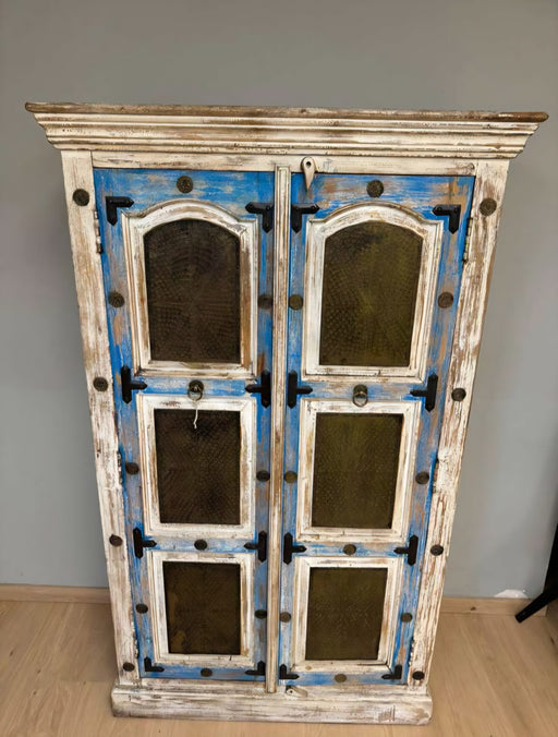 B: 117 H: 191 T: 50Indischer Schrank in Jodpur blau mit eingebauten alten Türflügeln und Eisenbeschlägen. Der Schrank ist aus massiver Akazie und daher sehr schwer un...