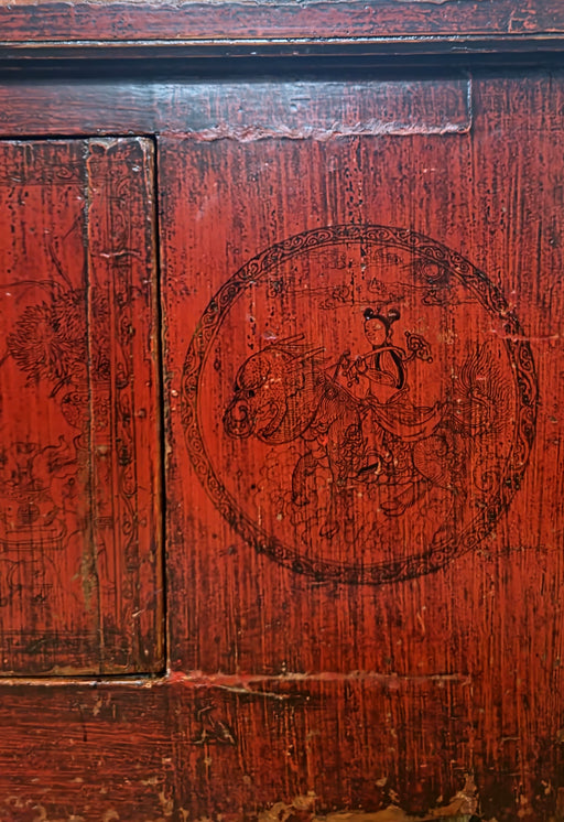 Extrem seltene, wunderschöne und sehr gut erhaltene alte China Truhe mit besonderer Patina und sehr schönem Blumenmotiv sowie chinesischen Schriftz...
